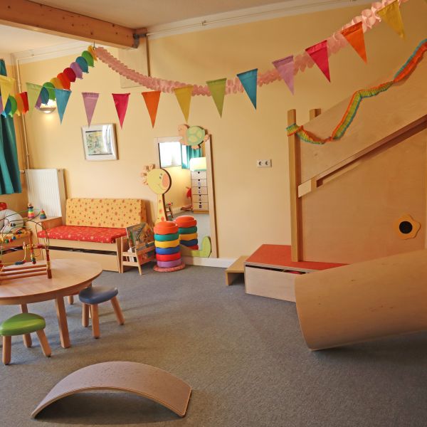 Unser Gruppenraum bietet den Kindern viel Platz zum Spielen und Entdecken. Er verfügt über eine Hochebene mit Rutsche, eine Kinderküche sowie zahlreiche Spielmaterialien – vom Konstruktionsspielzeug wie Bauklötzen und Duplo bis hin zu Verkleidungs- und Kleinkindmaterialien. Zur Mittagszeit verwandelt sich der Raum in einen gemütlichen Kuschel- und Schlafbereich.