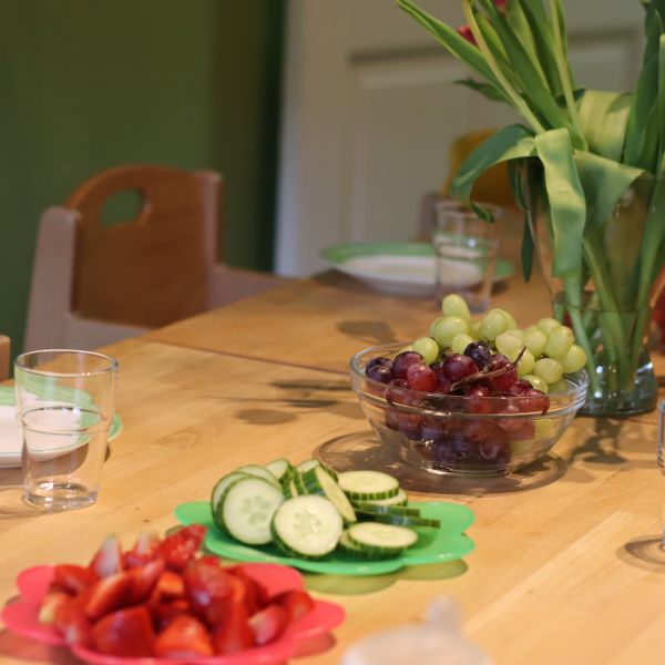 Ein zweiter Raum ist als großzügige Wohnküche gestaltet. Hier nehmen wir nicht nur unsere Mahlzeiten ein, sondern nutzen die Zeit auch für kreative Aktivitäten: Malen, Basteln, Puzzeln, Kneten oder Gesellschaftsspiele.
